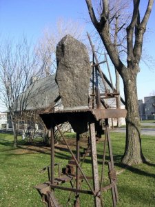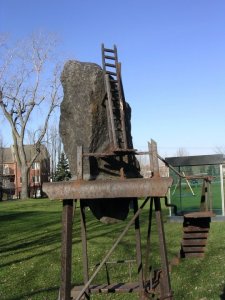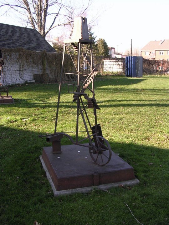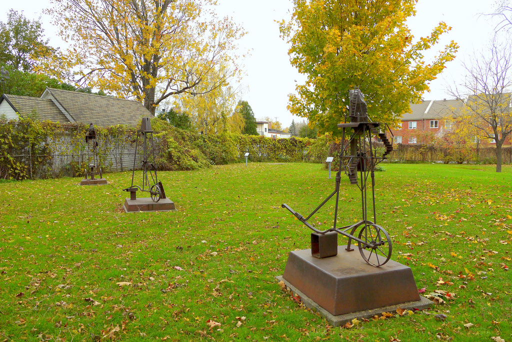 Regard ironique sur le savoir et les réalisations du génie humain (présence de la roue), les Lieux sans temple mettent à l’épreuve l’échafaudage de rêves et d’utopies de l’homme à la fin du XXe siècle. Ils questionnent la validité du progrès s’il ne s’appuie pas sur une profonde réflexion philosophique intégrant la culture et le social. Avec la série «Lieux en mémoire» et «Le Calme trompeur des grandes villes», Leblanc a poursuivi, dans les années 90, ce cycle de création où l’architecture, la maquette et la photographie contribuent à l’observation critique de la civilisation contemporaine et de la société de consommation. (Source: L’art public à Montréal, la collection municipale)