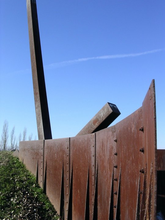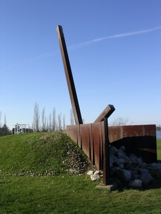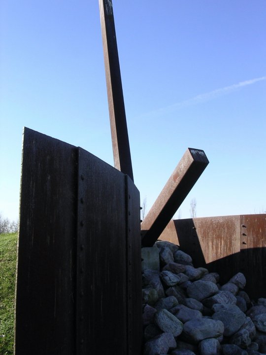 Deux parois de métal bordent une tranchée ouverte à même un monticule. Elles sont formées de panneaux boulonnés numérotés 01 à 06 et 001 à 006. Leur robustesse, leur dimension et leur facture industrielle évoquent la coque d’un navire et les madriers d’acier s’enfonçant dans le sol forment un angle qui rappelle les palans utilisés pour décharger la cargaison des navires. Entre les parois d’acier, des mœllons sont dégorgés. Le titre est une référence à Takis, sculpteur grec contemporain, qui a réalisé un cycle d’œuvres où dominait la présence de lignes verticales et intitulées Signal. Leblanc rend ainsi hommage à un artiste qu’il considère comme un des pionniers de la sculpture actuelle.