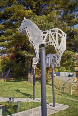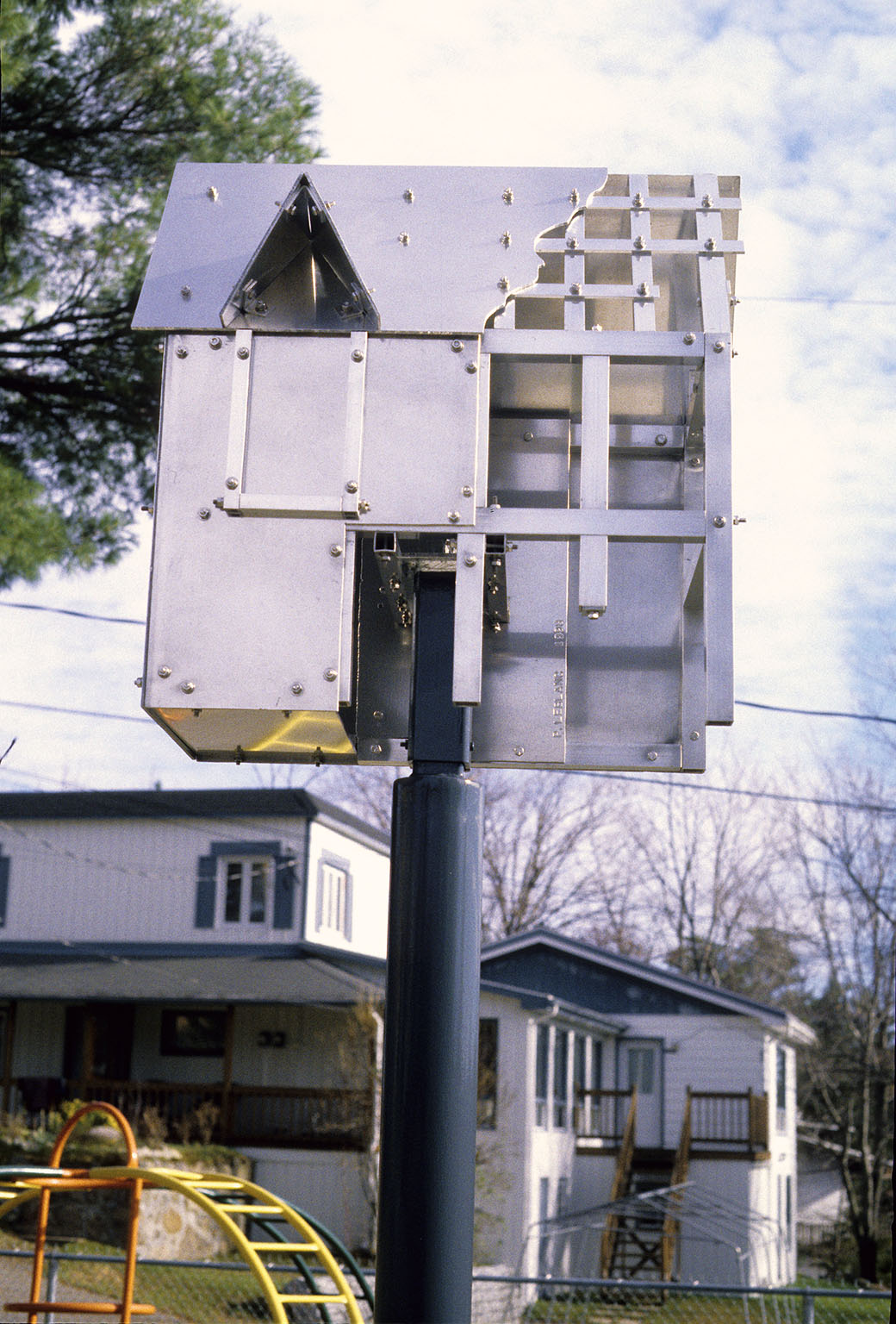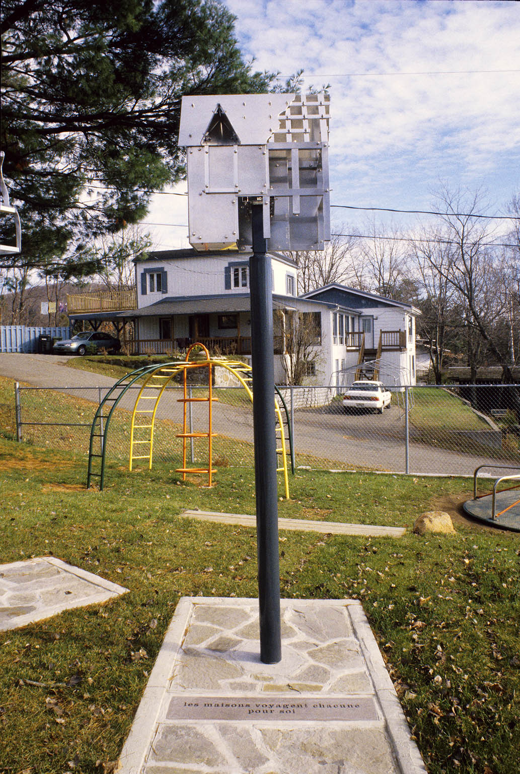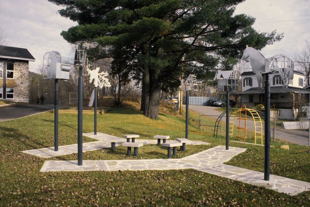 L’artiste s’est ici inspiré de la poésie de Gaston Miron, natif de la région des Laurentides. Aux six poèmes qu’il a choisis correspondent autant de sculptures, représentations du monde animé ou inanimé: une feuille, un cheval, une maison, un fauteuil, un rabot et un canot. À la base de chacune d’elles un fragment de poème est gravé et un parcours dallé se dessine. Fixée à l’extrémité d’un mât, à deux mètres du sol, chacune des sculptures montre une réalité dans sa totalité, l’enveloppe extérieure de l’être ou de la chose, mais aussi sa structure intérieure, sa face cachée. L’oeuvre, miniaturisée, est à l’échelle des enfants. Les bancs de granit rose, sur lesquels un mot tiré d’un poème est également inscrit, sont disposés en cercle au milieu des sculptures; ils appellent la conversation et l’ouverture à la créativité. (Source: Bilan 1998-1999. L’intégration des arts à l’architecture et à l’environnement, Ministère de la Culture et des Communications, page 13. )