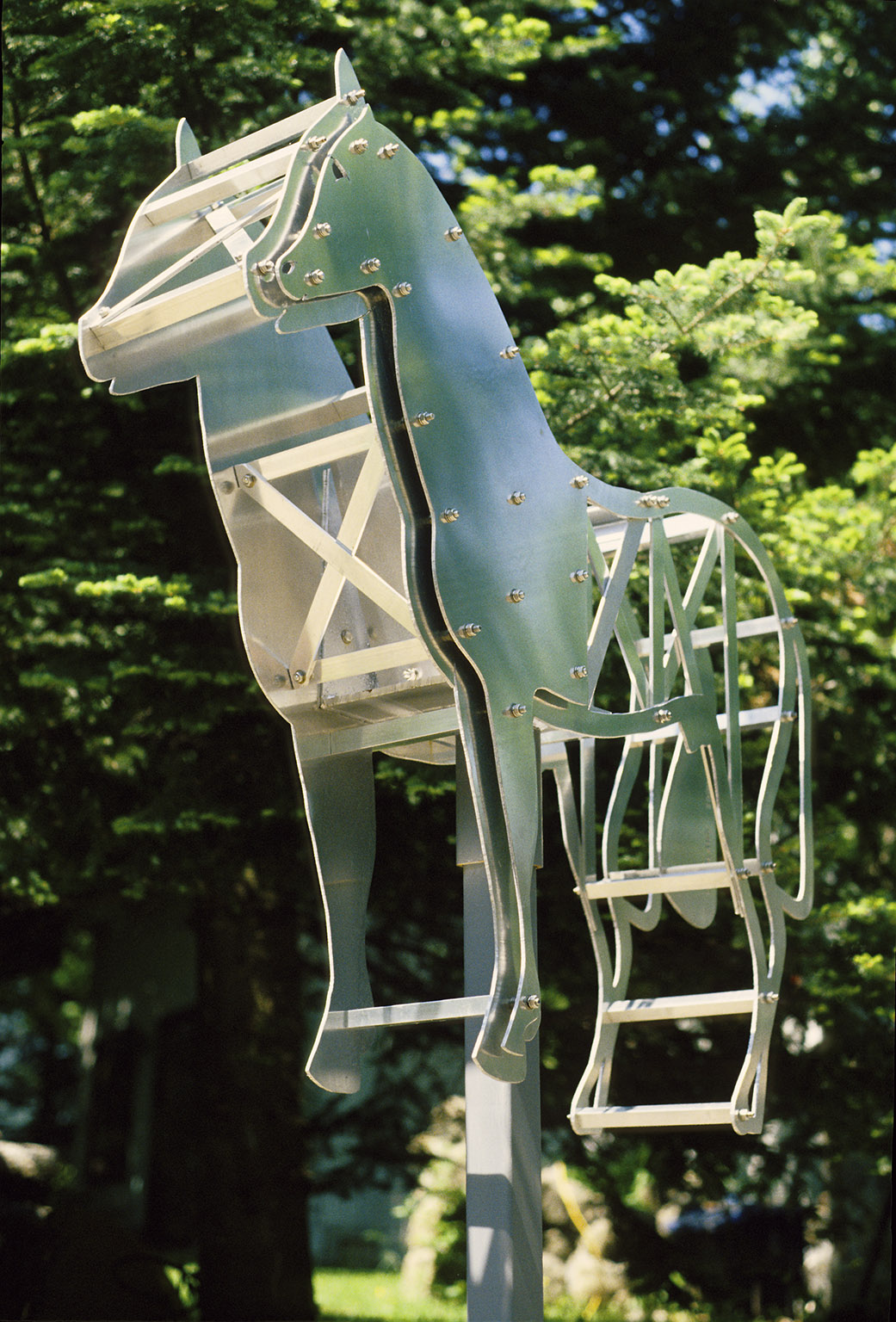 Pierre Leblanc est un des ces résistants. Homme de lutte, il a donné un second souffle à la poésie de Gaston Miron en la cristallisant sur la place publique. Il a brisé l’isolement du poète et il a permis à son oeuvre de s’épanouir, en lui offrant un lieu où plonger ses racines. De quelle façon ? En créant un ensemble de six sculptures magnifiques, dans la cour de l’école Saint-Jean Baptiste, en aluminium et en métal, à l’image des grands thèmes de L’Homme rapaillé. Le tout associé à des citations du recueil, gravées dans la pierre, au pied de chacune d’elles. La maison:« Les maisons voyagent chacune pour soi », le canot: « Je sais, c’est la Nord de mon enfance », le cheval: « J’avance en poésie comme un cheval de trait », le rabot: « Il s’avance en moi avec le goût du fils et des outils », la feuille: « Au coeur de la feuille l’idée de l’arbre », et le fauteuil: « Je commence à ressembler aux meubles ».