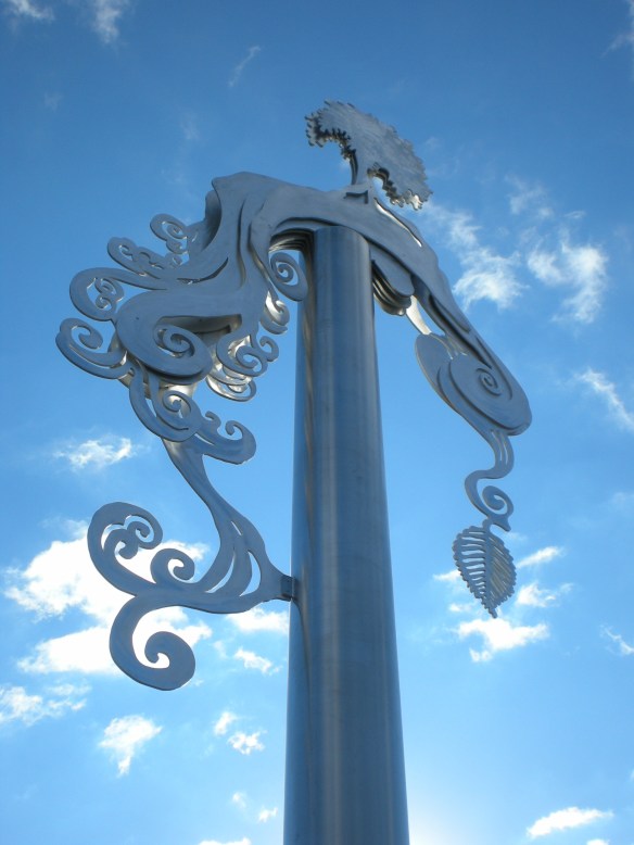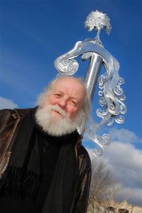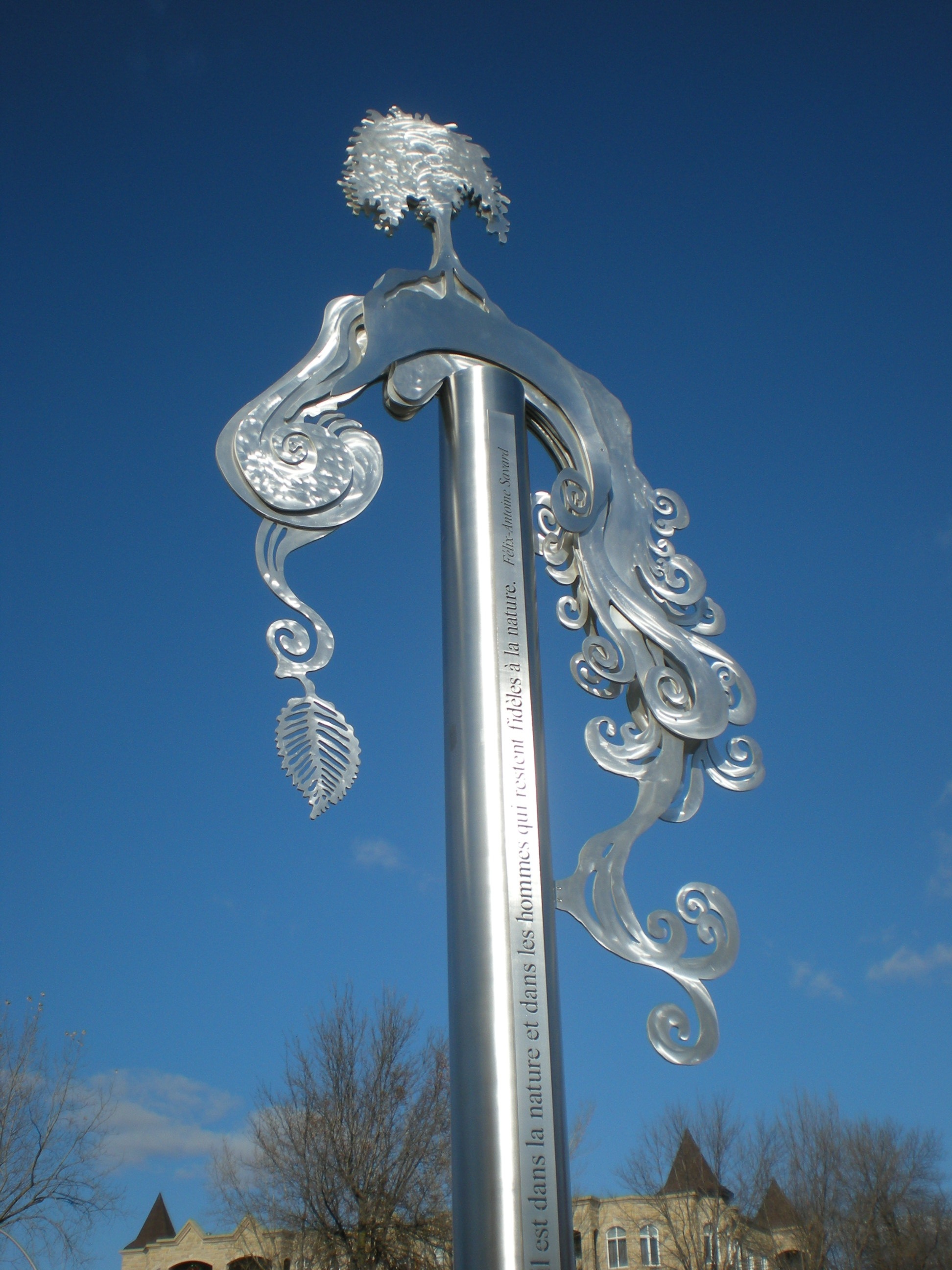 Ce qui a inspiré l’œuvre… la poésie de Gaston Miron et cette phrase tirée d’un texte de Félix-Antoine Savard : « L’espoir de l’avenir, il est dans la nature et dans les hommes qui restent fidèles à la nature. » Cette dernière est inscrite directement sur la sculpture, soit découpée dans l’acier inoxydable. D’autres inspirations : ladite visite avec le maire Benjamin dans le parc longeant le lac, le débordement de la Rivière du Nord au printemps 2010 et la lecture d’un livre concernant l’œuvre et la carrière de l’artiste japonais Takashi Marakami. C’est vraiment un assemblage de toutes ces données qui m’a permis de concevoir cette œuvre pour la Ville de Saint-Bruno-de-Montarville.