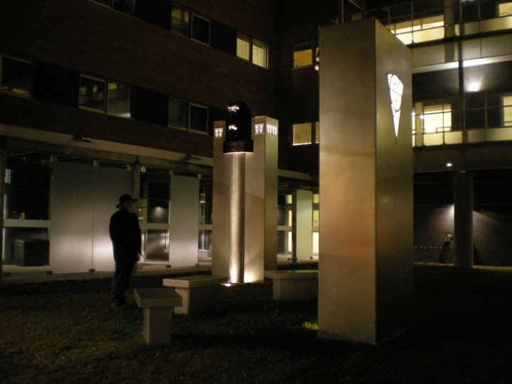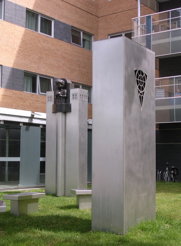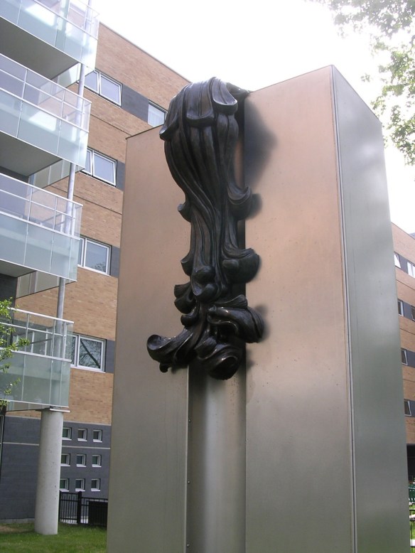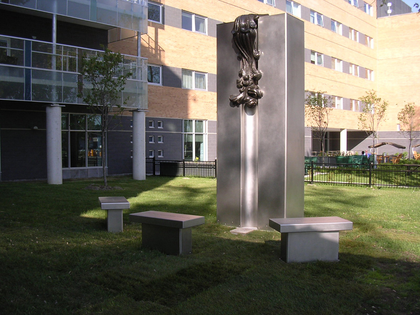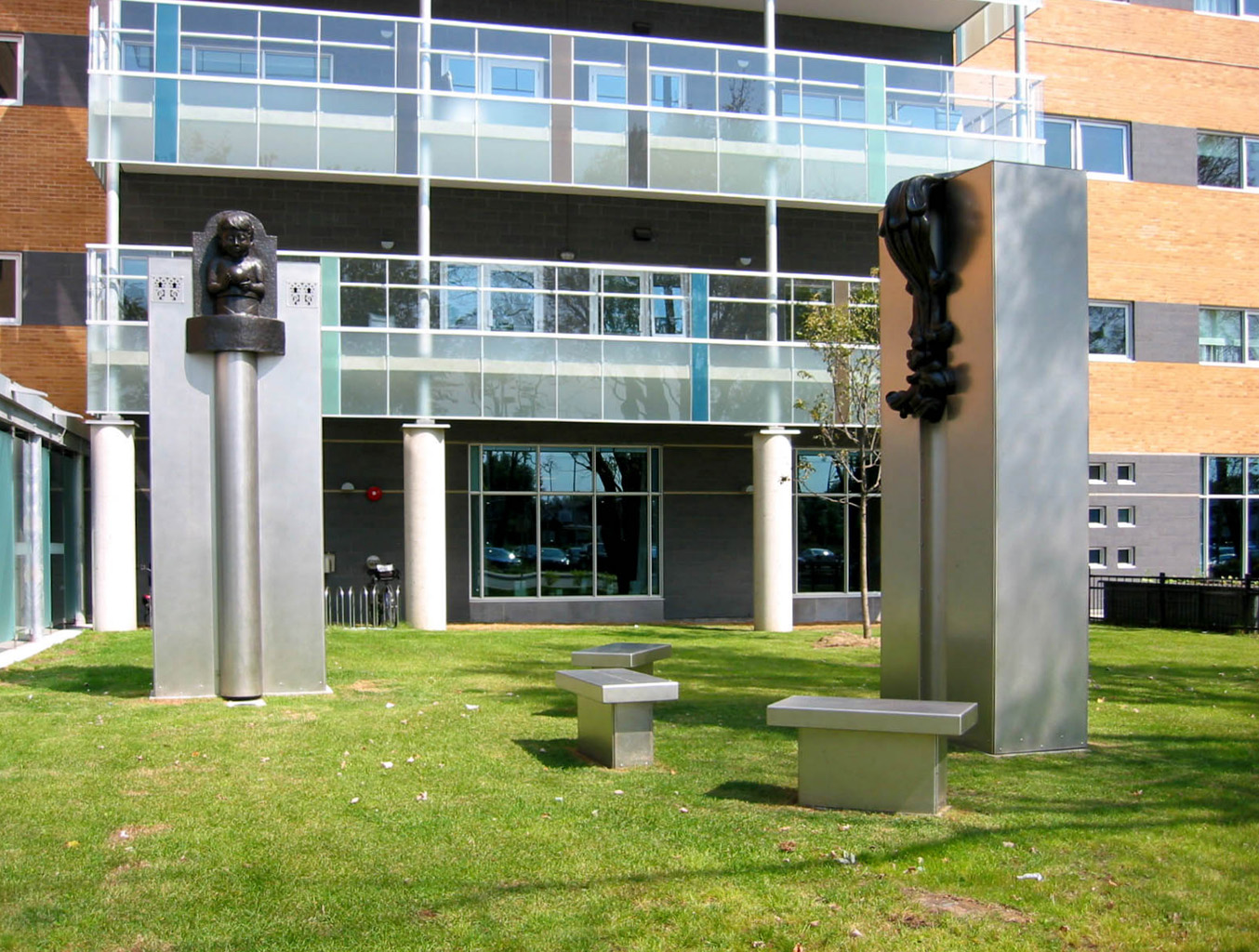 Ensemble sculptural de colonnes et de bancs. Sur les colonnes, on retrouve une feuille d’acanthe, une façade d’église et une tête d’enfant. Le texte est inscrit sur les bancs. (Source: PLEPUC, Présence du littéraire dans l’espace public canadien)