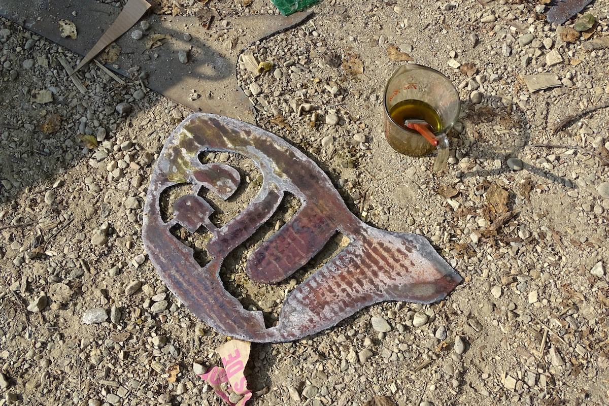 La feuille de Tinguely tiré de «Requiem pour une feuille morte» est maintenant tracée et prête à être découpée. Mon chalumeau sera bien aiguisé pour la circonstance. De plus hier une de mes amies facebook est venue me donner un bon coup de main. Elle a tout décapé la peinture sur mes tuyaux qui tiendront le rôle de colonnes. Le métal ainsi dénudé, va faire en sorte que je pourrai les traiter à l’acide muriatique afin d’obtenir la couleur désirée. J’ai d’ailleurs commencé le traitement sur l’une d’elles hier juste avant le passage de la pluie en fin de journée.