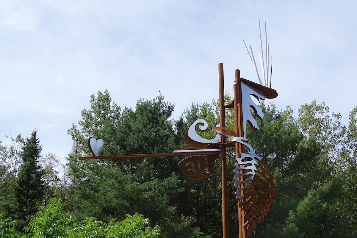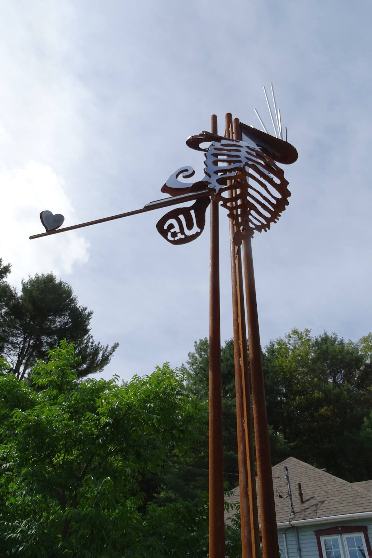 Un autre élément, c’est le cœur que j’ai emprunté aussi à la sculpture de Rigaud. Pour moi, il porte beaucoup de signification, dont celle-ci toute bête d’illustrer le texte de Miron, «Au cœur des feuilles l’idée de l’arbre». L’œuvre fait donc partie de cette série débutée il y a quelques années déjà. Mais l’ensemble, se veut un hommage à Jean Tinguely et c’est d’ailleurs ce qui a fait dire sans doute à mon fils Charles lors d’une de nos conversations téléphoniques que le cœur c’était celui de Niki de Saint-Phalle, la femme de l’autre.