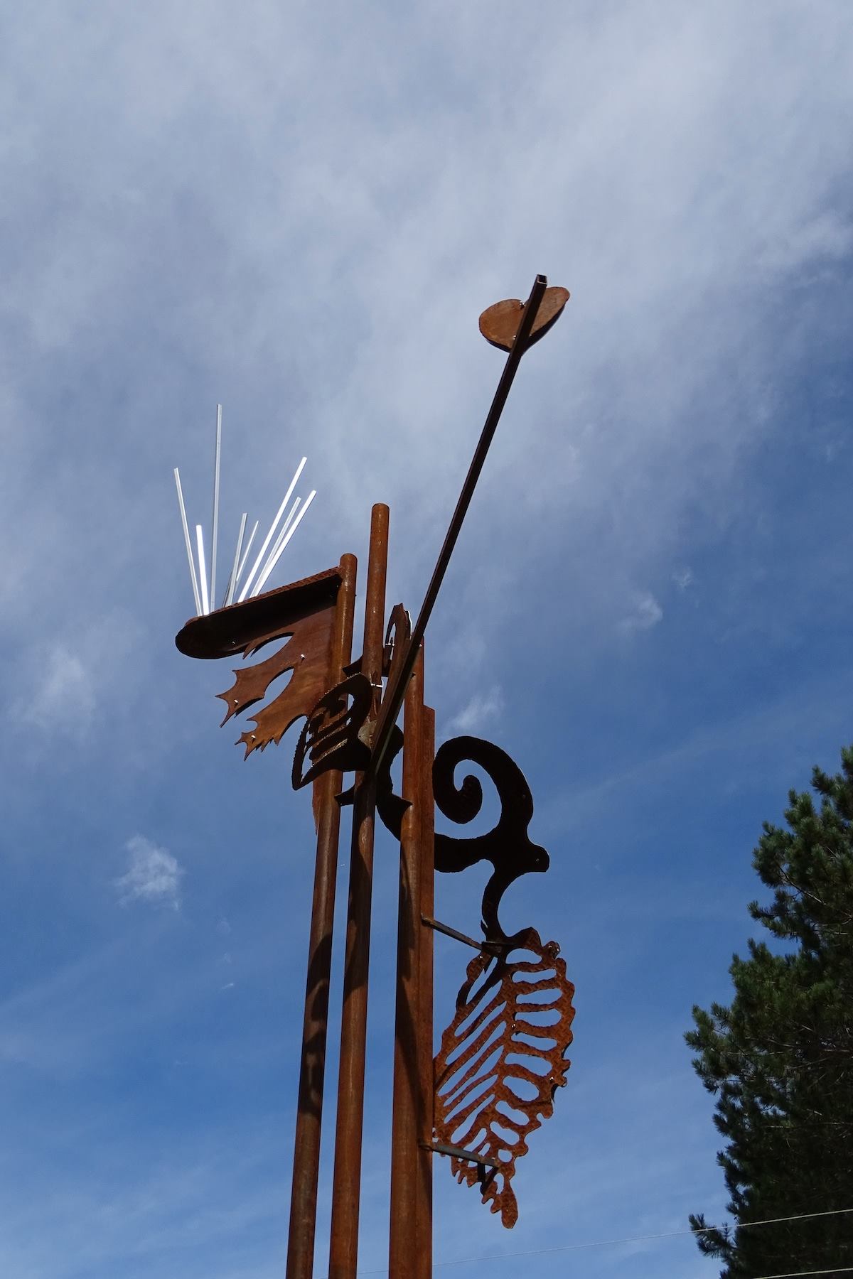 La feuille avec la petite spirale, ainsi placée très haute perchée est tirée d’une sculpture de Jean Tinguely, que j’avais vu une première fois au pavillon suisse d’Expo 67. J’avais dix-huit ans ! Cette sculpture je l’ai revue plusieurs années plus tard à Beaubourg, mal placée au bout d’un corridor qui ne menait nulle part !