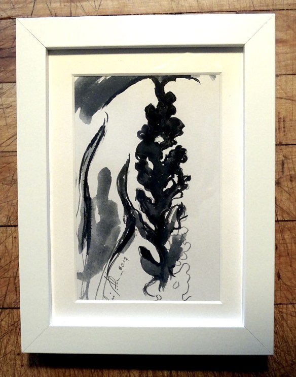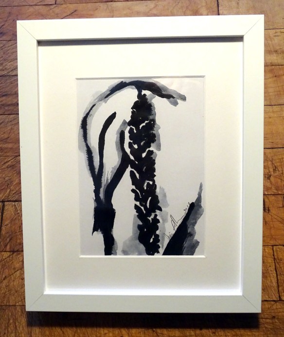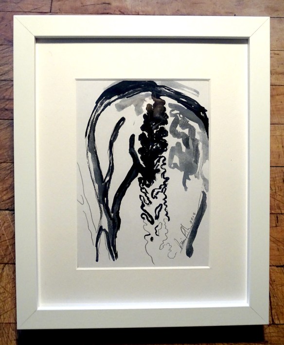 Titre de l’oeuvre : Chiendent no 2, 2017. Papier chiffon à l’encre de Chine et lavis. Dimensions encadrées : 20 cm x 15 cm ou 8 pouces x 6 pouces.