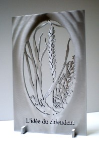 2500$ Une sculpture découpée en aluminium (où il sera inscrit «Signes & Repères» à la place de «L’idée du chiendent».)
