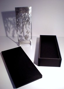 800 $ Une petite sculpture découpée en aluminium de 12 pouces x 4 5/8 pouces, signée par l’artiste et numérotée (tirage limité à 15 exemplaires). De plus, votre nom sera inscrit et gravé avec le mien sur la plaque honorifique qui accompagnera le retable.