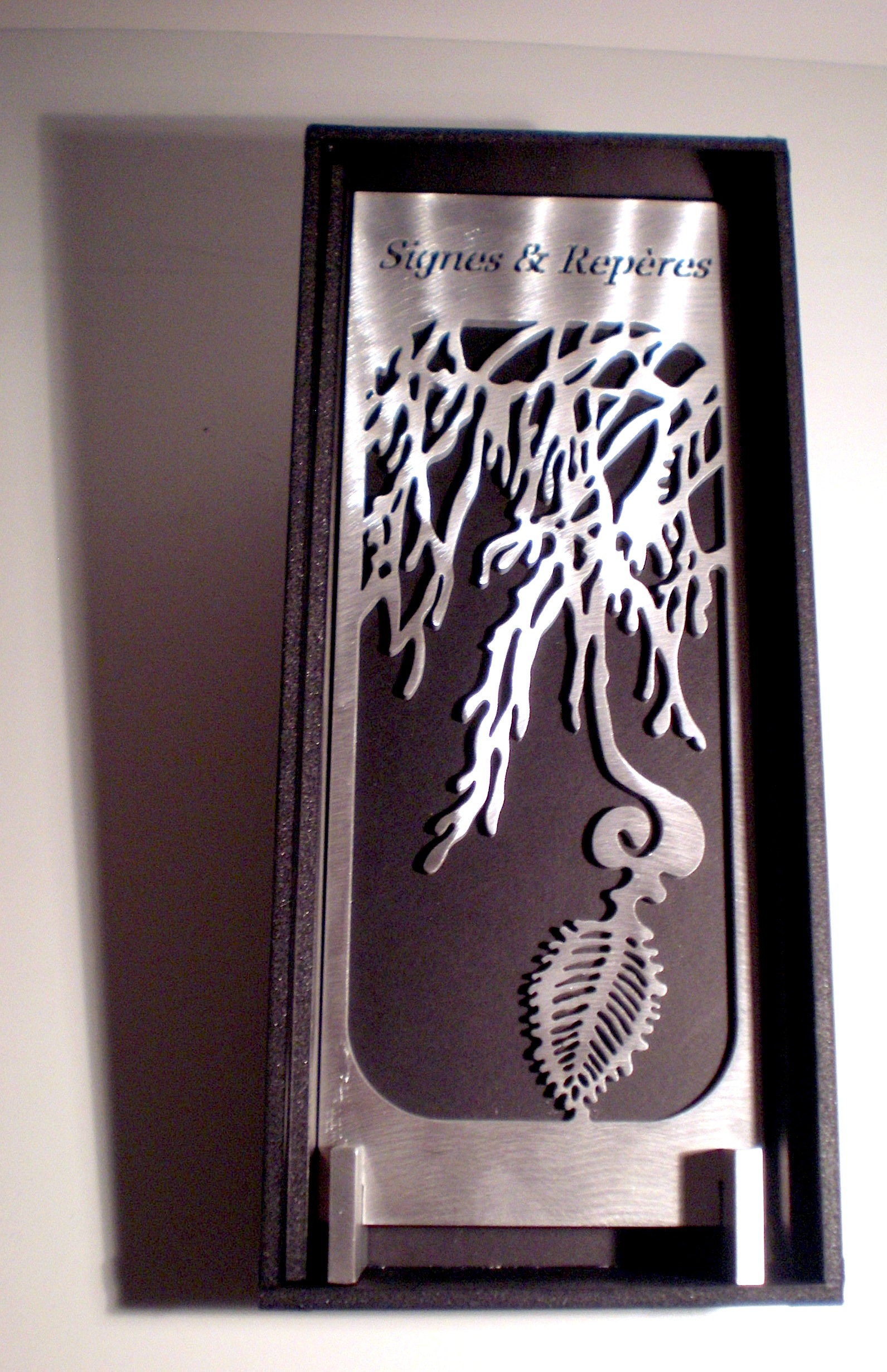 2500$ Une sculpture découpée en aluminium (où il sera inscrit «Signes & Repères» à la place de «L’idée du chiendent».)