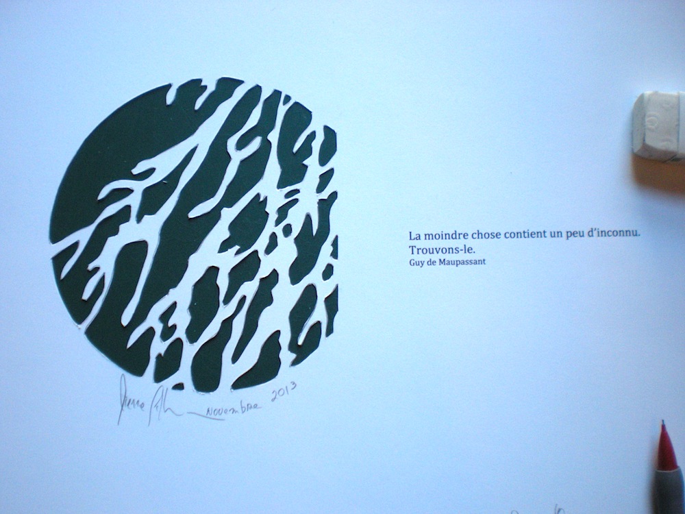 Ce matin j’ai passé un p’tit moment de temps avec Guy de Maupassant. C’est la pensée de ce grand écrivain que j’ai arrimée au papier à découper pour l’œuvre qui sera dédiée à monsieur Olivier Talon de France. J’aime beaucoup cet aspect de mon travail qui consiste à œuvrer pour chacun de mes collaborateurs et dans le cas de cet œuvre, leurs assigner une pensée qui, je crois, va leur plaire.