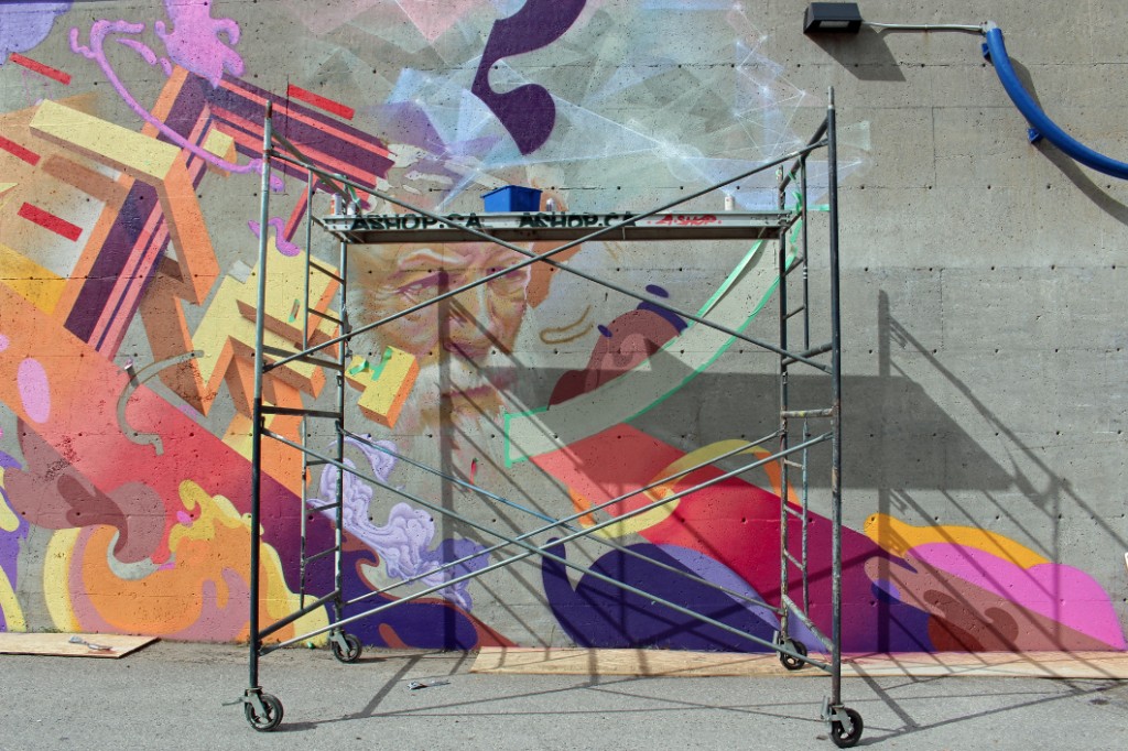 « La murale, qui aura mis environ une dizaine de jours à réaliser, est sortie tout droit de l’univers créatif de trois artistes du collectif A’Shop, soit Ankh, Dodo Ose et Zek sous l’œil attentif de Mik, gérant de production (alias Ankh… eh oui!) » – Marie-Ève Cloutier