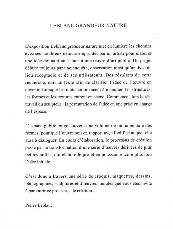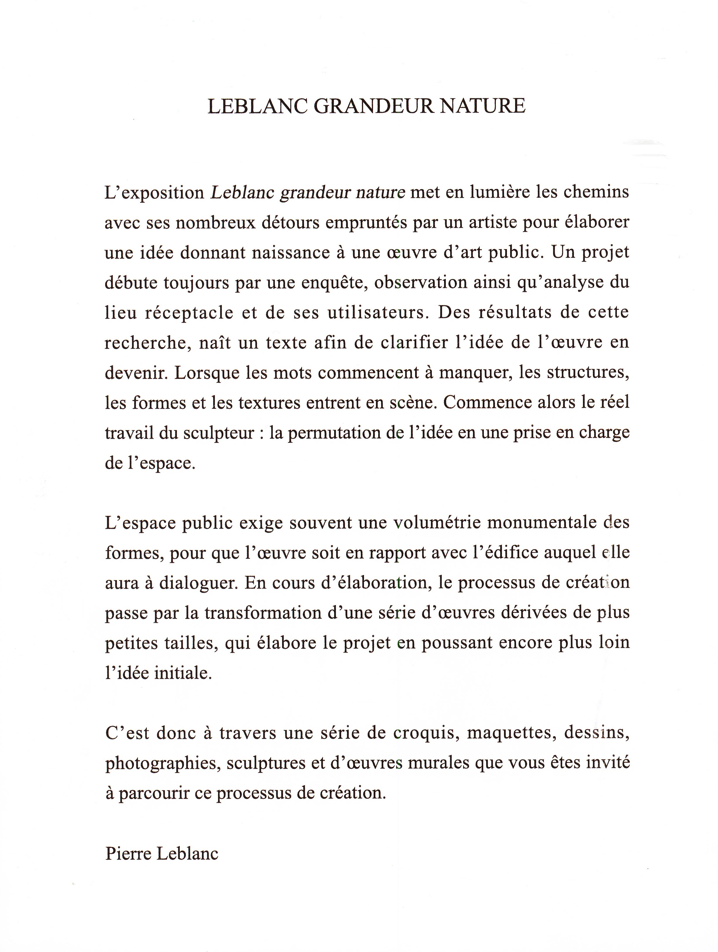 L’exposition Grandeur nature de Pierre Leblanc a eu lieu au Centre d’exposition du Vieux-Presbytère de Saint-Bruno de Montarville, du 26 avril au 17 mai 2009.