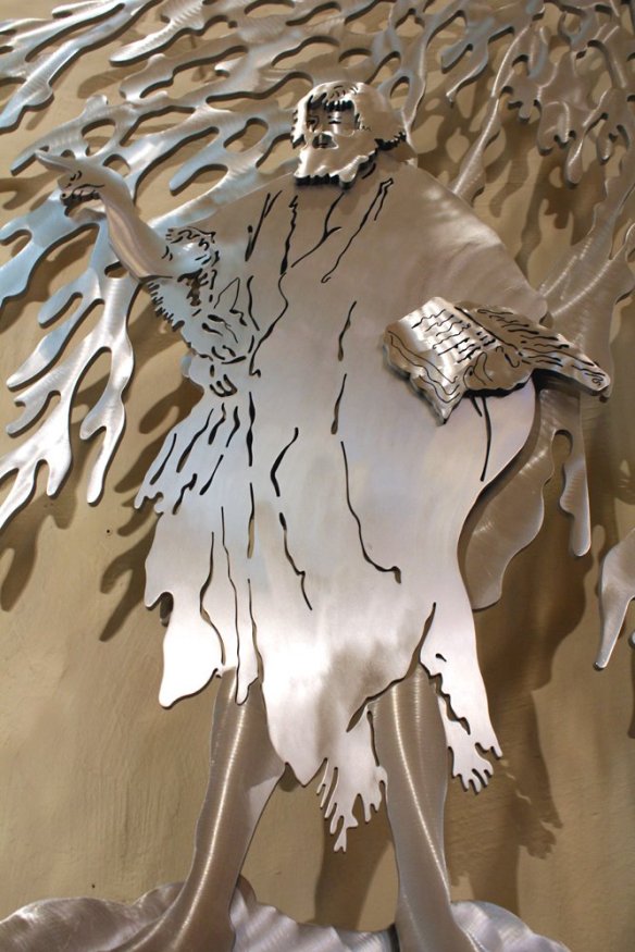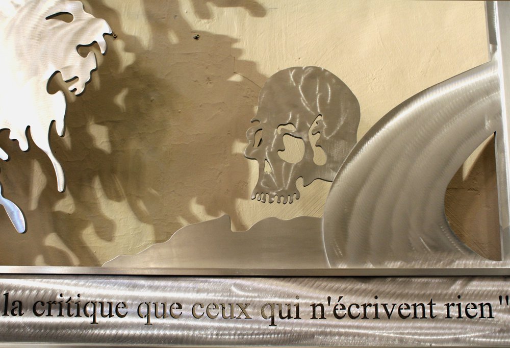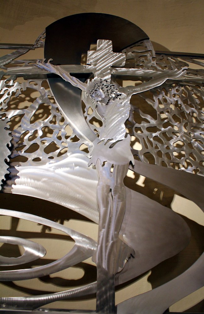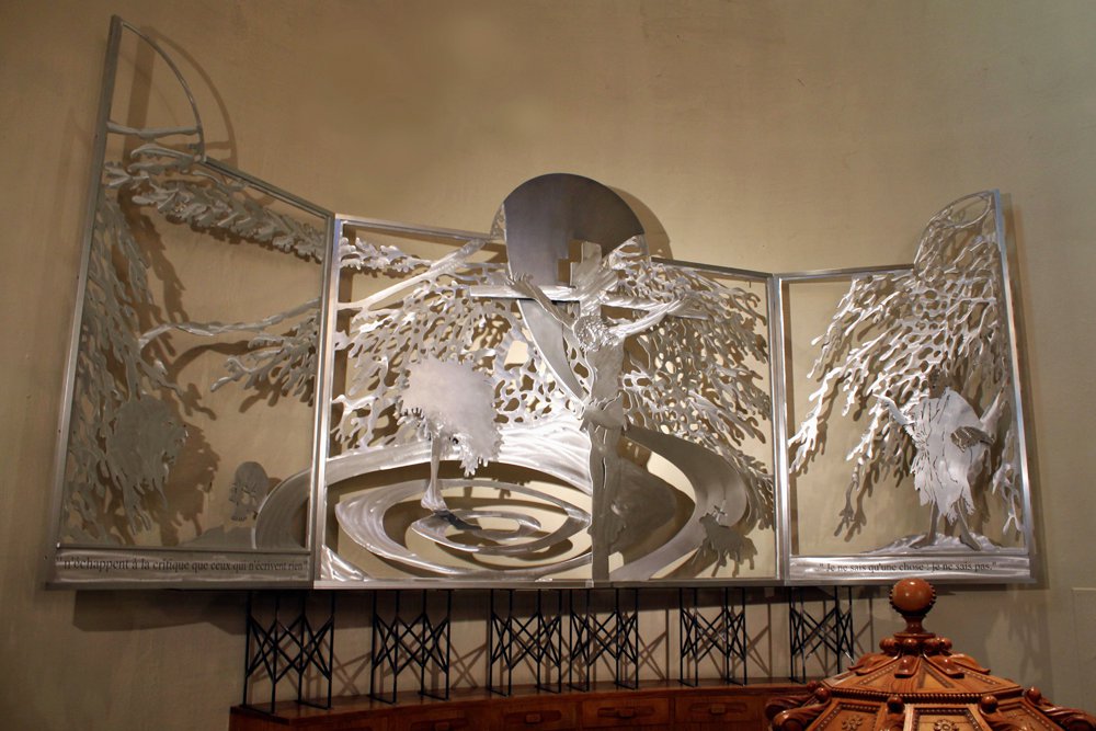 Inspiré du retable de Matthias Grünewald à Colmar et de celui de Keith Haring à l’église Sainte-Eustache à Paris, Pierre Leblanc interpelle directement l’art sacré en installant une murale d’aluminium montée sur une table d’acier bleui. Découpée au jet d’eau, son iconographie est tirée à la fois de l’art religieux (à travers l’étude du retable de Grunwald, dont il c’est inspiré fortement) et de sa recherche actuelle sur la nature.