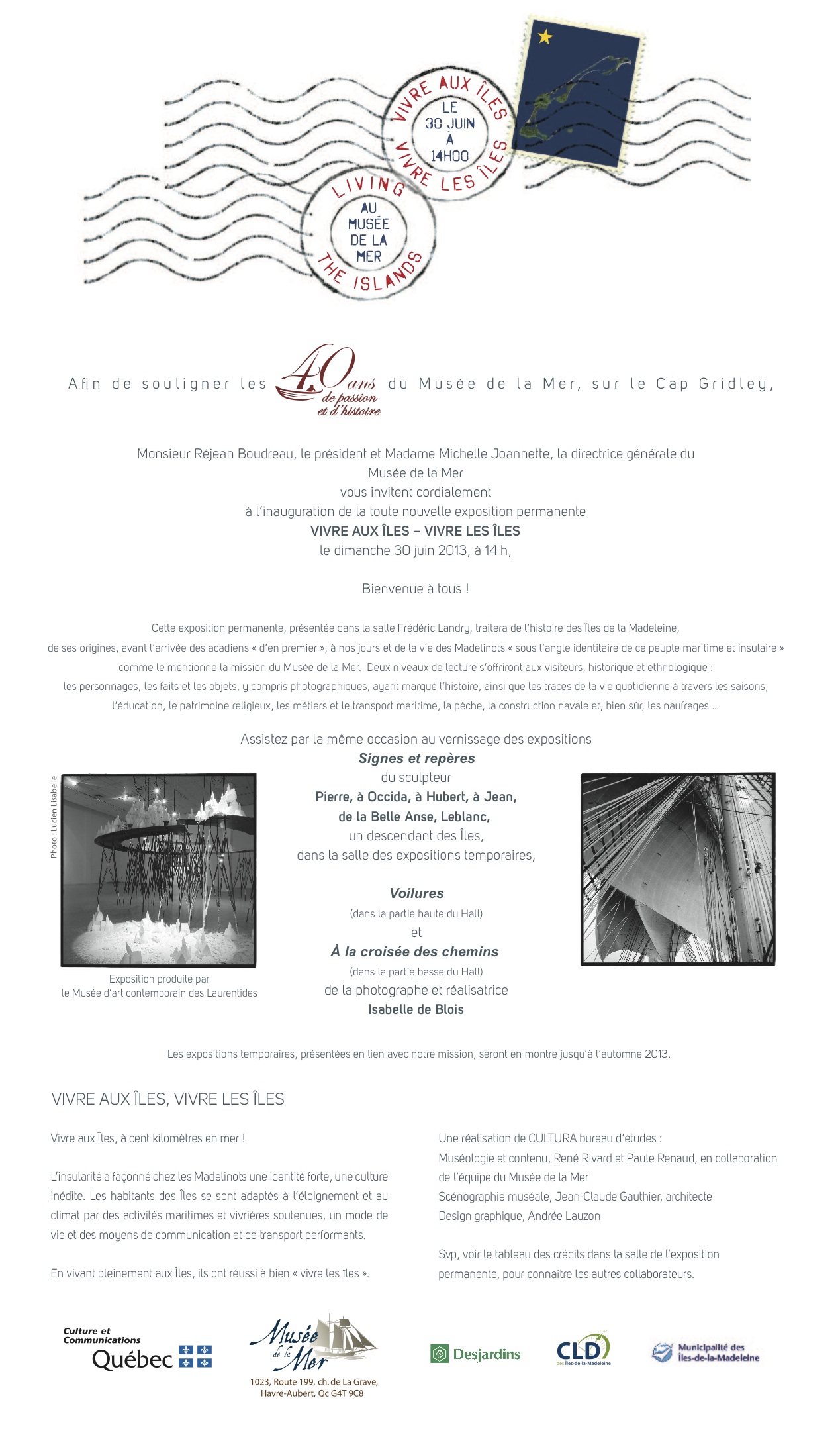 Ceci se faisait bien ressentir au Musée de la Mer en ce dimanche 30 juin 2013 lors d’un quadruple vernissage. En effet, le public a assisté à l’inauguration de Vivre aux îles- Vivre les îles, la nouvelle exposition permanente du musée et à celle des expositions temporaires Signes et Repères de Pierre, à Occida, à Hubert, à Jean, de la Belle-Anse, Leblanc ainsi que Voilures et À la croisée des chemins d’Isabelle De Blois.