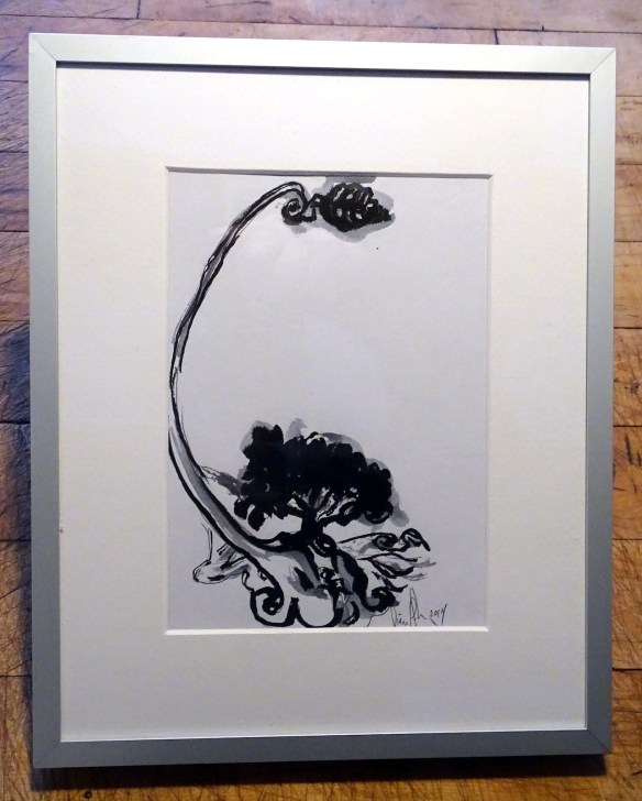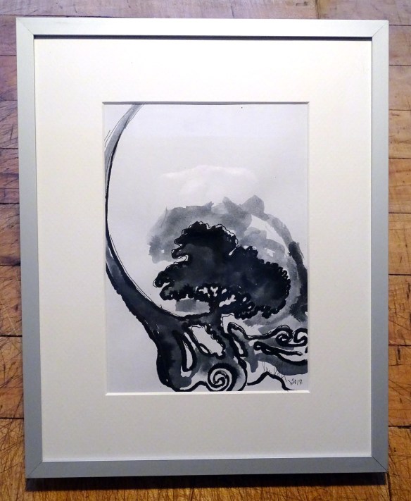 Titre de l’oeuvre : Le soupir du vent no 7, 2014. Papier chiffon à l’encre de Chine et lavis. Dimensions encadrées : 20 cm x 15 cm ou 8 pouces x 6 pouces.