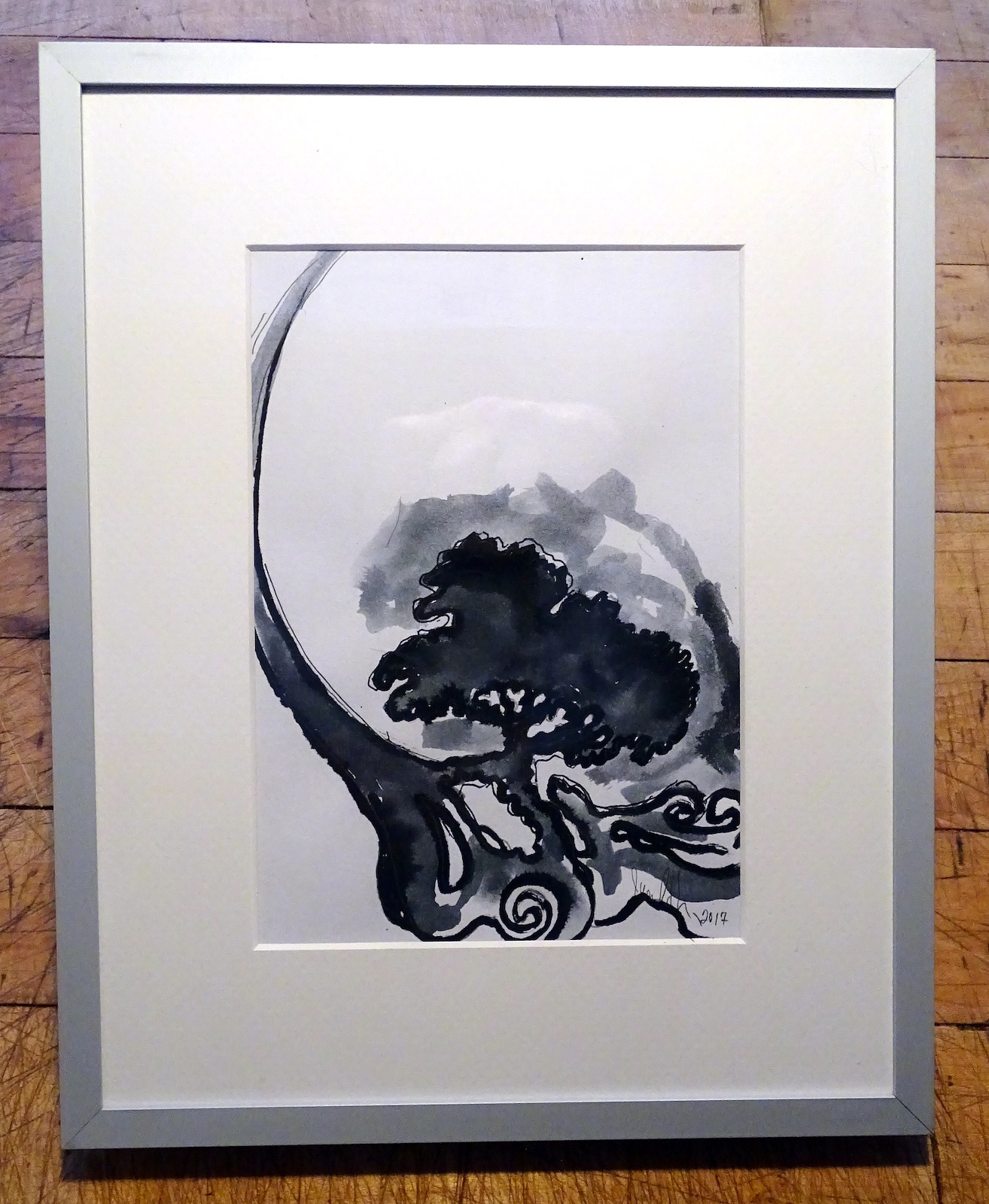 Titre de l’oeuvre : Le soupir du vent no 10, 2015. Papier chiffon à l’encre de Chine et lavis. Dimensions encadrées : 20 cm x 15 cm ou 8 pouces x 6 pouces.