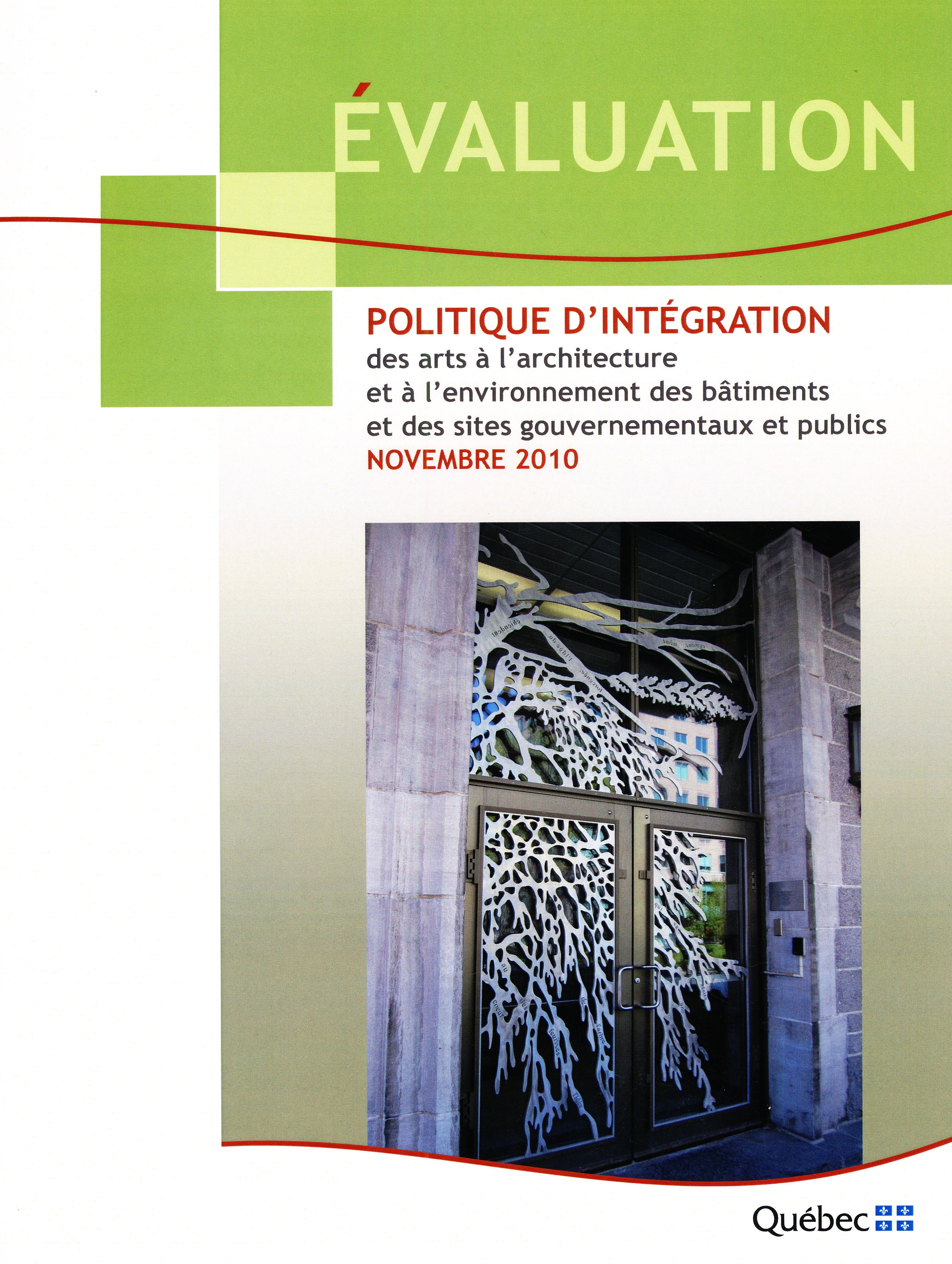 Photo de l’œuvre de Pierre Leblanc De Marc-Aurèle Fortin à Vaillancourt en passant par Miron pour le Ministère de la Culture et des Communications à Québec sur la page couverture du document d’Évaluation pour la Politique d’intégration des arts à l’architecture et à l’environnement des bâtiments et sites gouvernementaux et publics, novembre 2010.
